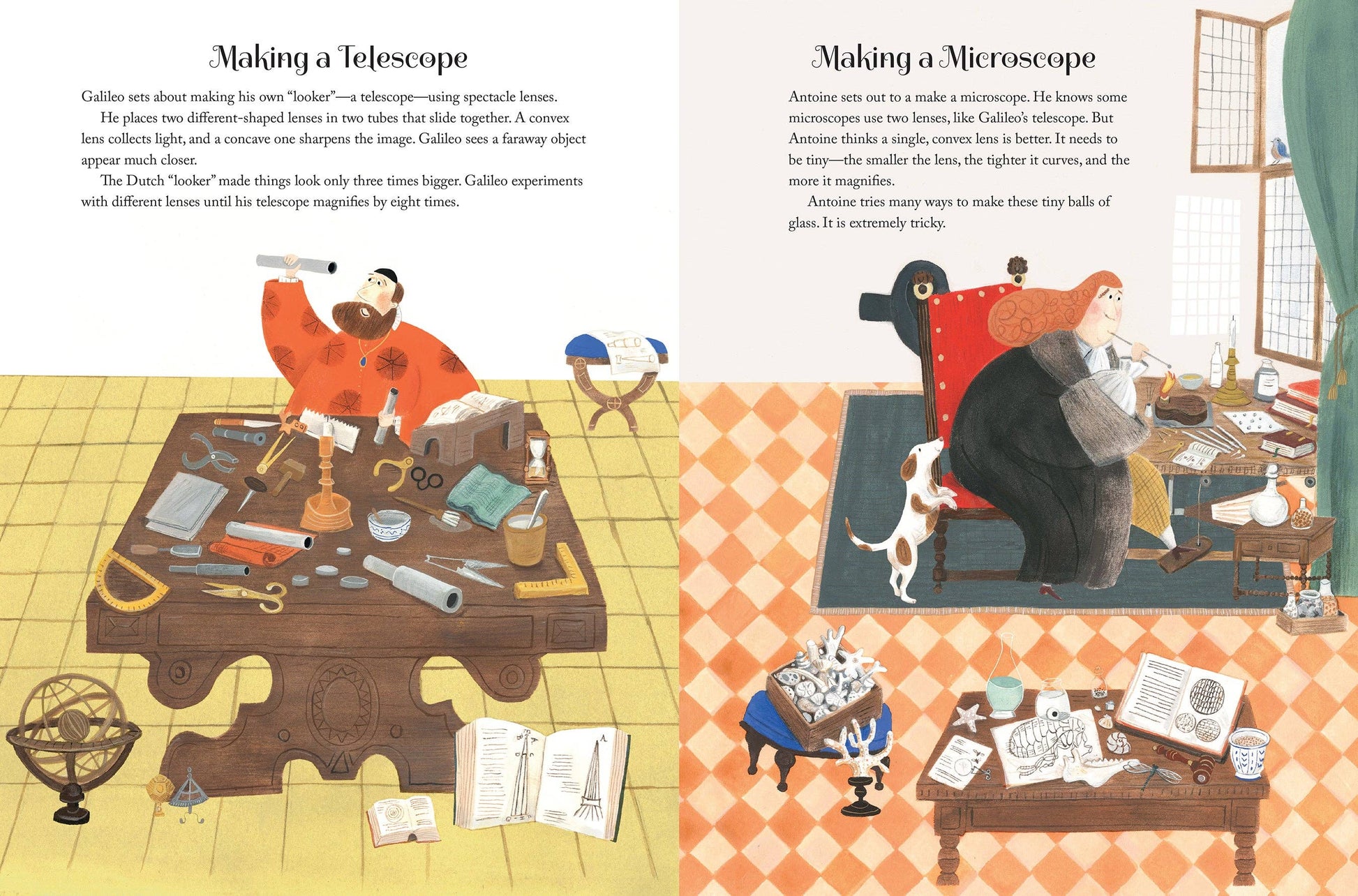 Deux philosophes naturels – désormais connus comme scientifiques – ont utilisé des outils similaires mais ont vu le monde très différemment. Antonie van Leeuwenhoek a regardé de près des gouttes d'eau, tandis que Galileo Galilei a regardé au loin dans l'univers. Ce qu’ils ont découvert a ébranlé les fondements de la compréhension humaine et a conduit à des innovations dans les microscopes et les télescopes. Ce traitement graphique et engageant de leur histoire, qui a remporté le Mathical Honor Book 2025 dans la catégorie 3e à 5e années, captivera les esprits curieux et incitera les futurs scientifiques à continuer de poser des questions.