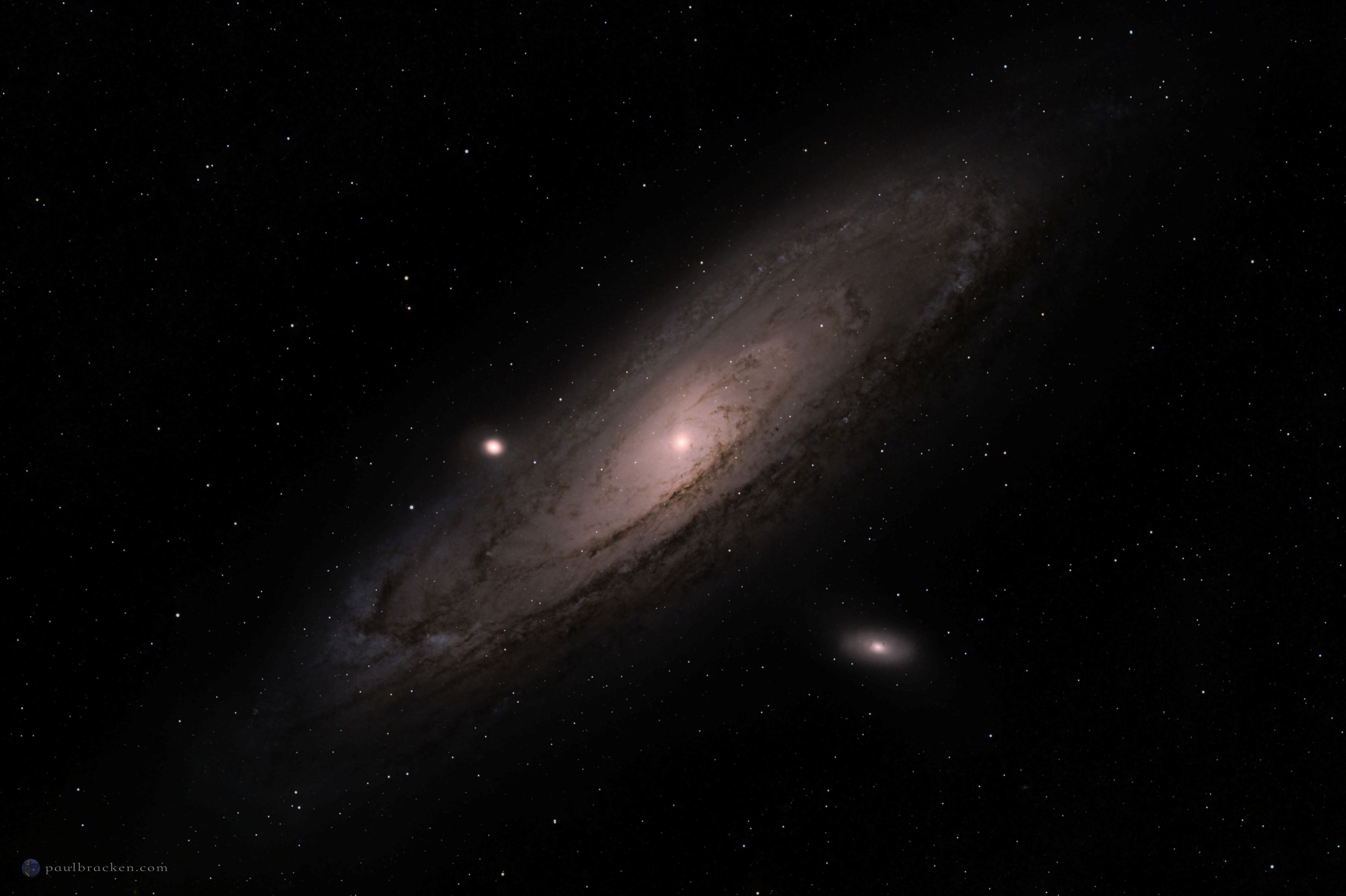 I've wanted to take a photo of Andromeda Galaxy ever since I saw it portrayed in an episode of Star Trek, back in the 1970's. This image was taken in August, 2023. At a distance of only 2.5 million light years, Andromeda is our closest major galactic neighbor, and looks to be a little larger than our own galaxy - the Milky Way. It's currently speeding toward us, on a collision course, which means at some point we'll have difficulty getting the whole galaxy into a single frame. Our galaxy is thought to have a similar spiral shape, so maybe there's an observatory in an Andromeda star system that just published a comparable photo of us. There are two fairly obvious satellite galaxies visible here also - M32, (top and left of center), and M110, (below and to the right).