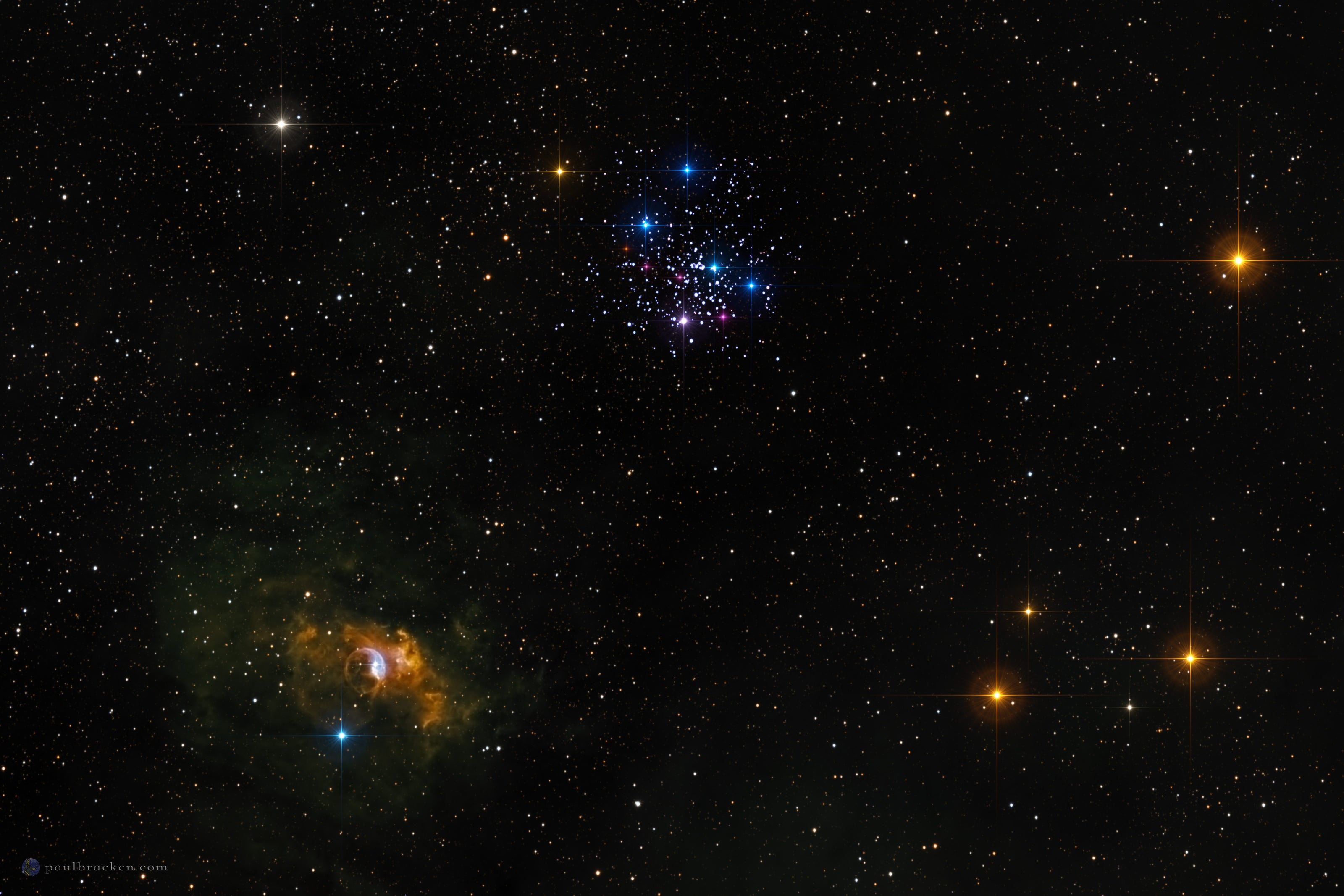 Pair text with an image to focus on your chosen product, collection, or blog post. Add details on availability, style, or even provide a review.I chose this image as my holiday photo for 2023, as I think it has a festive aura. In the upper middle is the open star cluster M52, sometimes referred to as the Scorpion Cluster. It is color-enhanced here for effect. M52 is a loosely-bound grouping of stars that all originated from the same cosmic dust cloud. Because of this, the stars in the cluster all have more or less the same composition and age, but have a variety of different masses. This gives us a useful opportunity to study how the lifecycle of a star relates to its size. In the lower left section, you can see the Bubble Nebula, which I think resembles a holiday bauble. This bubble was created by the expansion of nebulous material driven by the stellar wind from a hot, young star. Although both the star cluster and the nebula can be seen in the same part of the sky, in the constellation of Cassiopeia, the nebula is much farther away from us. It is 11 thousand light years distant, whereas M52 is about 4,600 light years away.