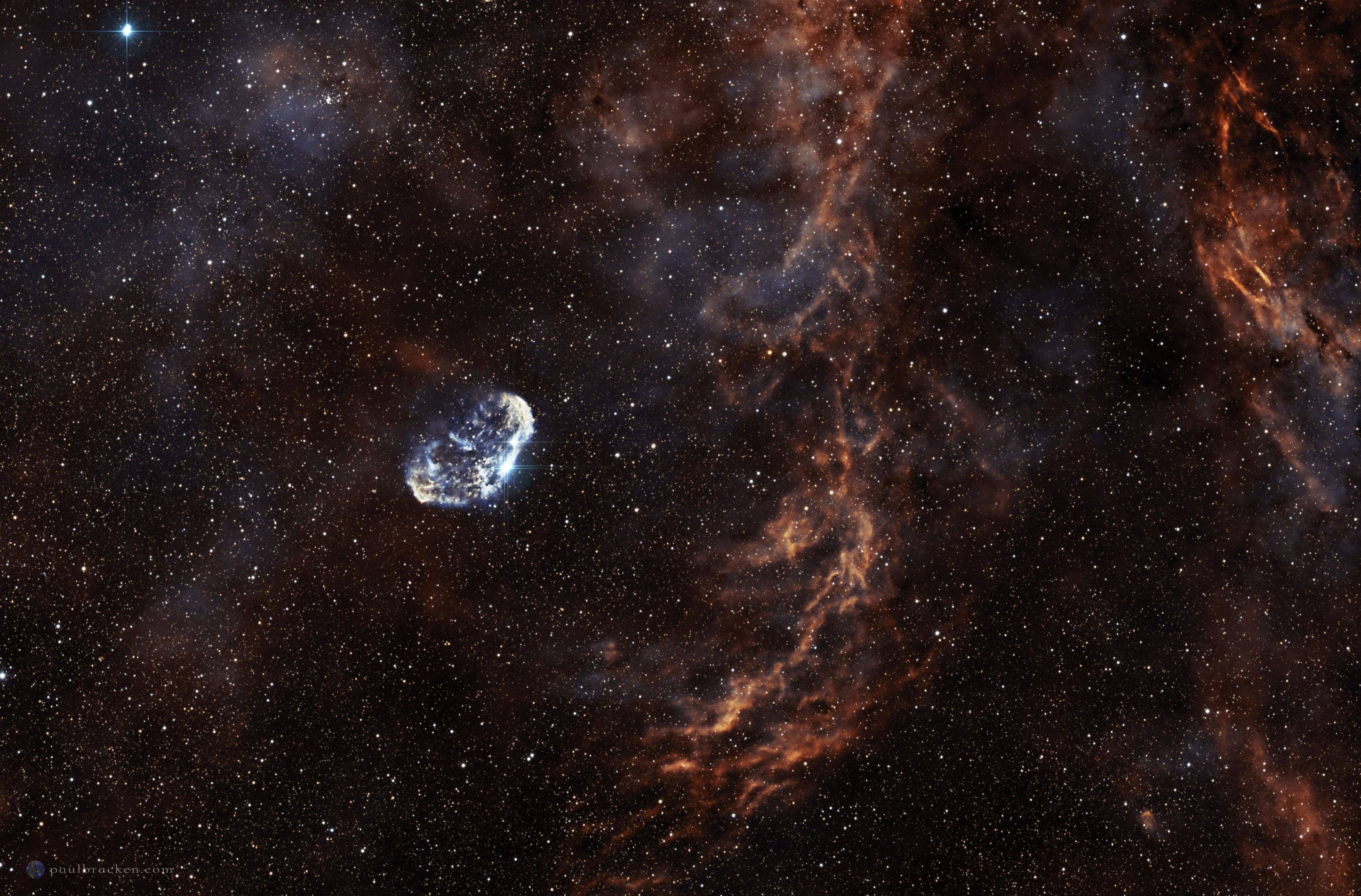 That hard-to-miss bright blob just left of center is called the "Crescent Nebula." It originated a few hundred thousand years ago, when the central star expelled its outer layers. This was a time when our ancestors lived a hunter-gatherer existence, and our planet was coinhabited by no less than three different hominid species. Since that time, the expelled material has moved steadily outward, forming a shell around the star. Radiation from that same star then began to collide with that shell of material, molding the complex shapes you see here, and causing it to glow brightly. Some of the photons resulting from that interaction then traveled through space for five thousand years until they arrived in my back yard and impacted the sensor in my camera in August, 2024. I was using a wide-field camera, so you can see other regions of nebulosity, some of which are considerably closer to us than the Crescent.