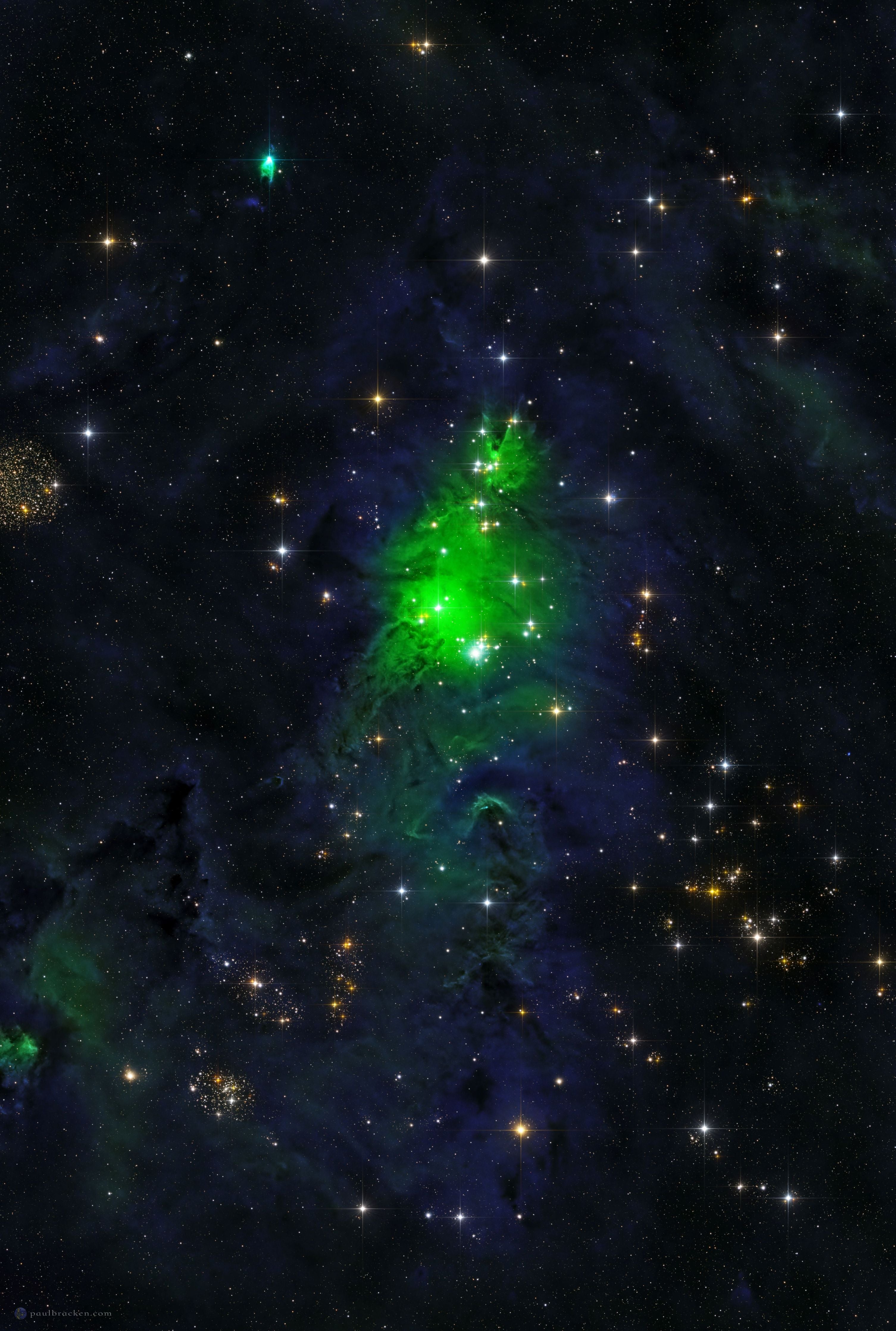 Taking my cue from NASA, I added a significant amount of green to enhance the illusion of the Christmas Tree, while preserving a lot of the surrounding fainter nebulosity. But unlike the NASA video, I refrained from making the stars blink on and off. :-)