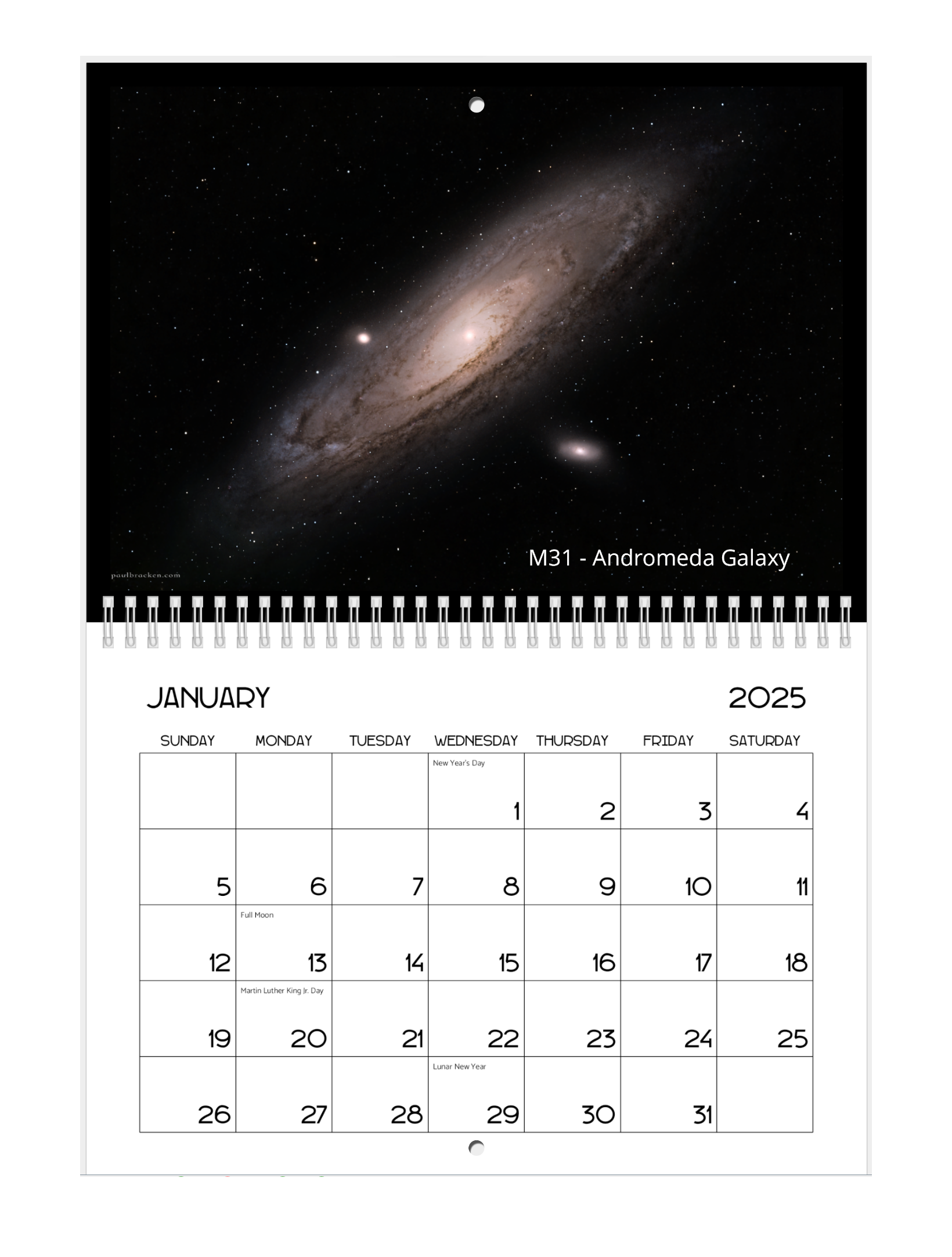 - Our 2025 Calendar offers a stunning monthly showcase of the observatory's deep space collection, featuring high-quality glossy prints that capture the intricate details of nebulae and galaxies. Each large-format image allows you to closely examine the complexity and beauty of these places, making it an ideal addition for astronomy enthusiasts seeking both visual inspiration and educational insight throughout the year.