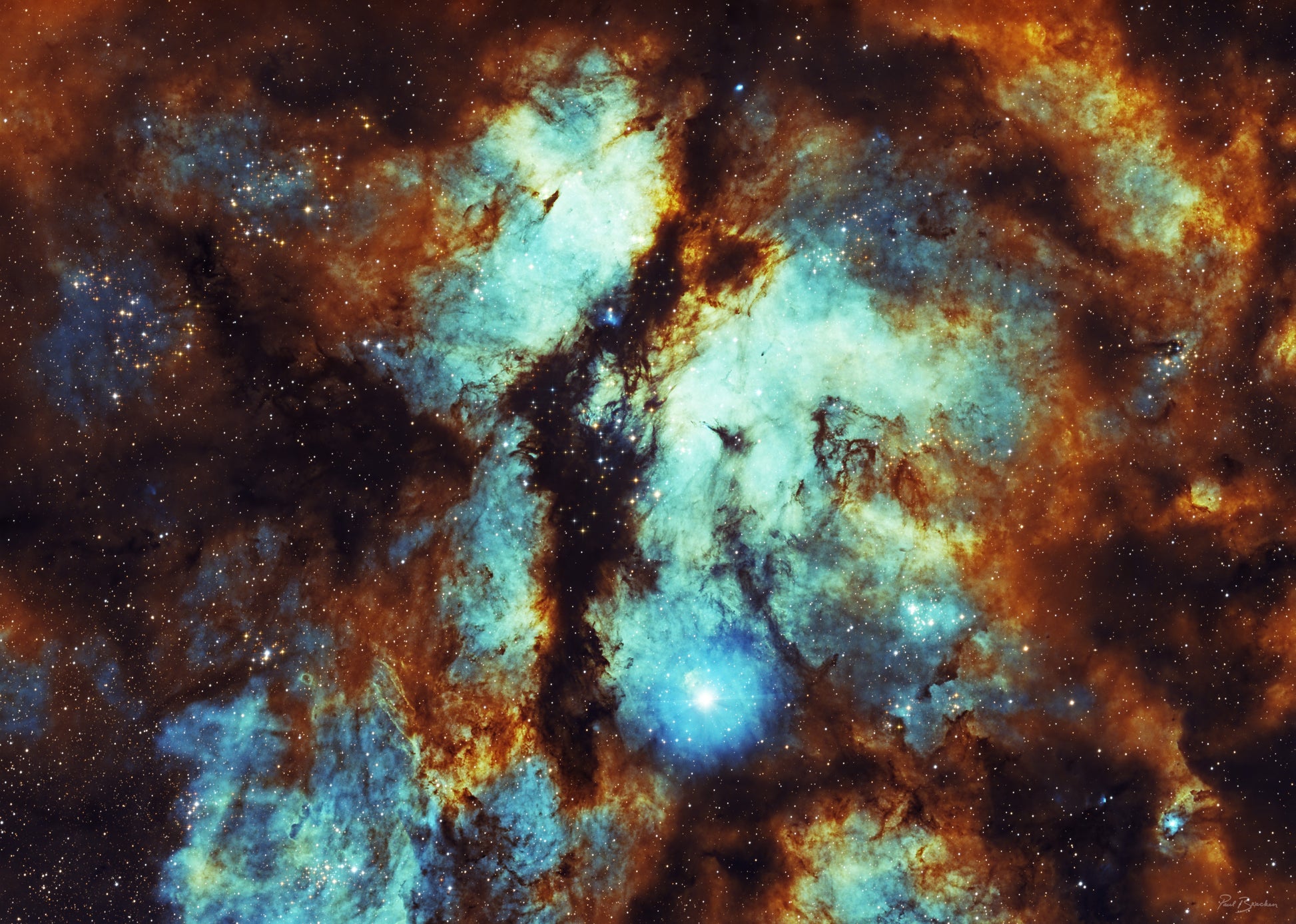 Here you can see the Butterfly Nebula in its full glory. The dark nebula running up the middle forms the butterfly's body, with the bright wings stretching out to the sides, showing up in a sort of teal color.